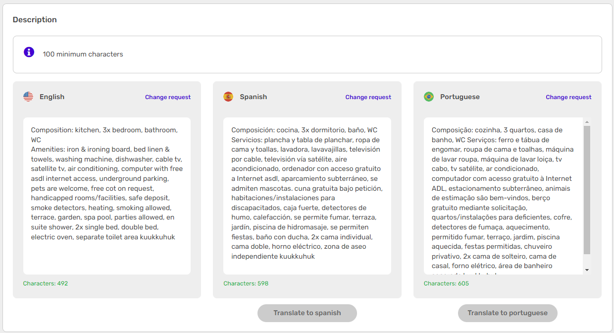 Description is the summary of all information about the property that might be useful for the guests. It may be accompanied by translation in different languages. The description text is either generated automatically based on the information provided in the Step 2: Amenities stage or it can be typed manually.