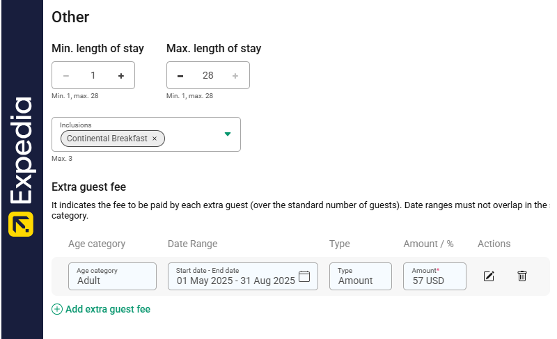 It indicates the fee that needs to be paid for each guest over the Number of guests. The date ranges cannot overlap within the same age category. Age categories are retrieved from Expedia and can be set up in Expedia extranet.
