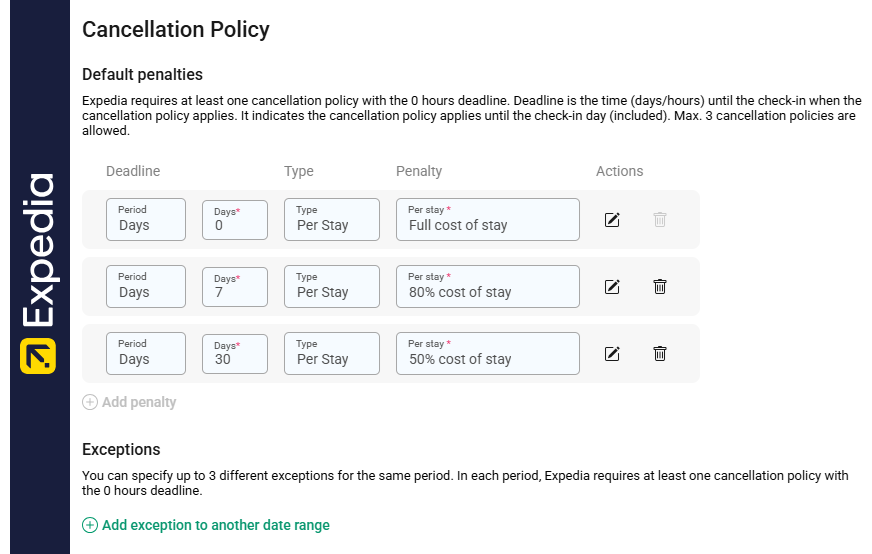 Exception date range - range when the different cancellation policy applies. You can specify up to 3 different exemptions for the same period. In each period, Expedia requires at least one cancellation policy with the 0 hours deadline.