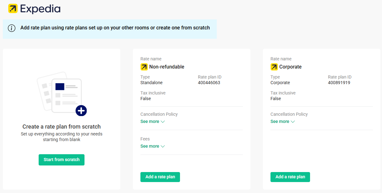 When adding a property to Expedia, we create only 1 standalone rate plan by default. If you want to diversify your offer, you can create additional rate plans in Rentals United and they will be automatically created in Expedia.
