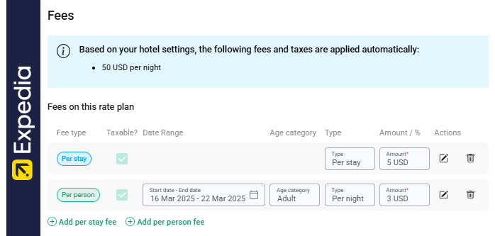 Specify additional fees and taxes that apply only when this rate plan is selected. Use it when you offer additional services in specific periods, for example in the high-season.