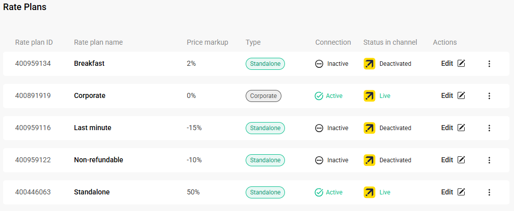 If you have any rate plans that are Inactive, you can activate them back. When you activate the rate, we will perform a full update of pricing and availability. Your guests will be offered this rate again.