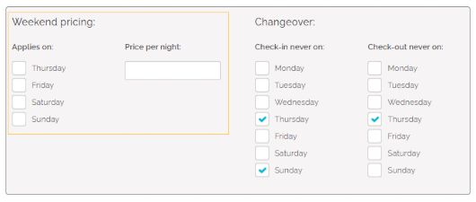 Changeover restrictions specify whether check-in or check-out is allowed for a given day. This is a great option if you need the guests checking in and out to fit your schedule and it will help you avoid unexpected guests. If some days are restricted from changeovers, then your guests will simply not be able to select such a stay if the start or end day falls on a changeover-restricted day.