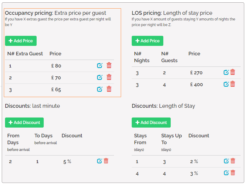 In Occupancy pricing, it is possible to specify pricing plans for different numbers of guests. The difference between Extra guest price and Occupancy pricing lies in fact that with Extra guest price the same price is applied for each extra guest. On the other hand, in Occupancy pricing it is perfectly possible to specify different prices for different numbers of guests. Note that Occupancy pricing takes precedence over Extra guest price.