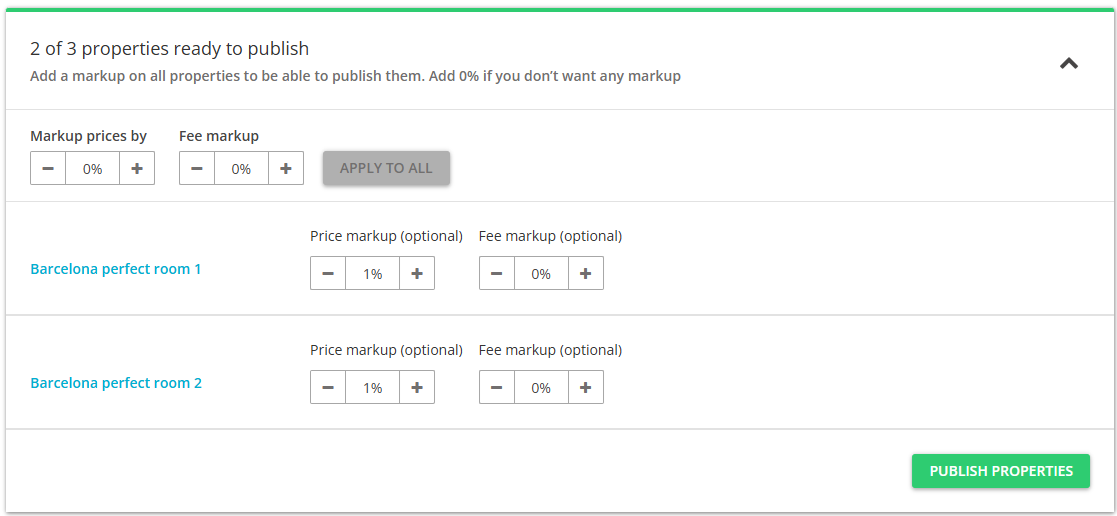 If the properties are ready to publish, adjust the markup for each of them. You can adjust the mark-up for each property one by one or apply the same mark-up value for all at once.