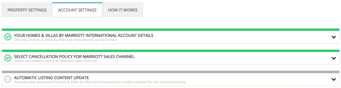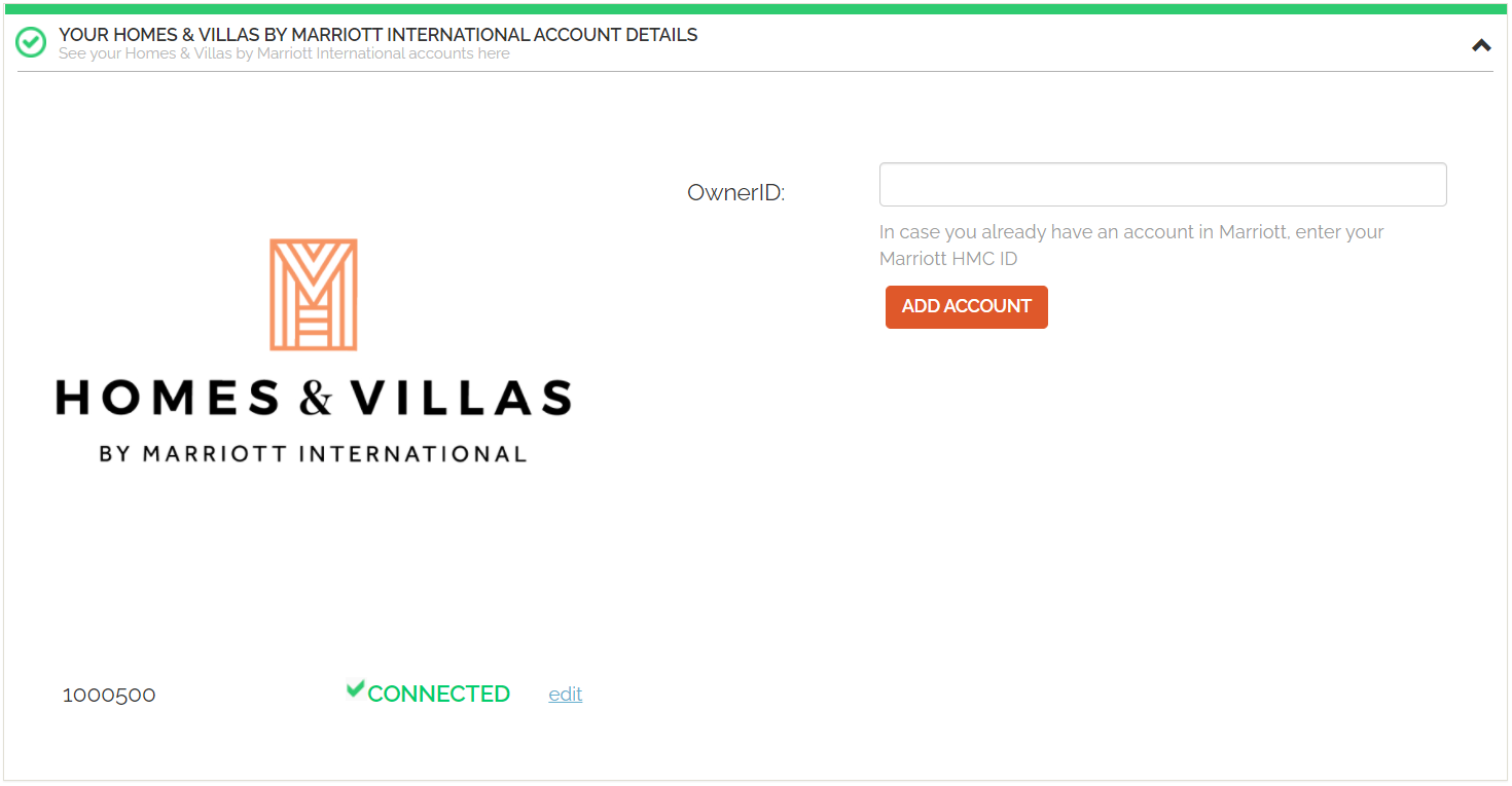 - Select the Homes & Villas by Marriott Bonvoy account details section. If you want to link another account, provide the Homes & Villas by Marriott Bonvoy OwnerID and click the Add account button. If the validation is successful, the Property settings page can be opened and you can connect properties.