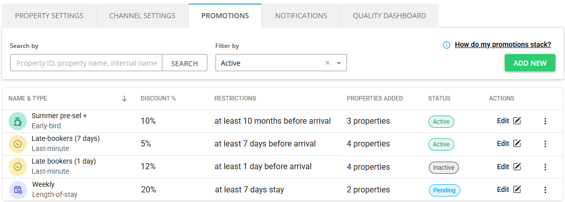 | Example promo: 10% for bookings made 2 months and more before the check-in | Example promo: 10% for bookings made 3 days and less before the check-in | Example promo: 10% for weekly stays, 15% for monthly stays |