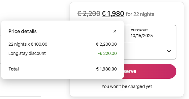 - If you have multiple discounts of the same type (e.g. weekly and monthly), the one that is the most beneficial for the guest will apply.