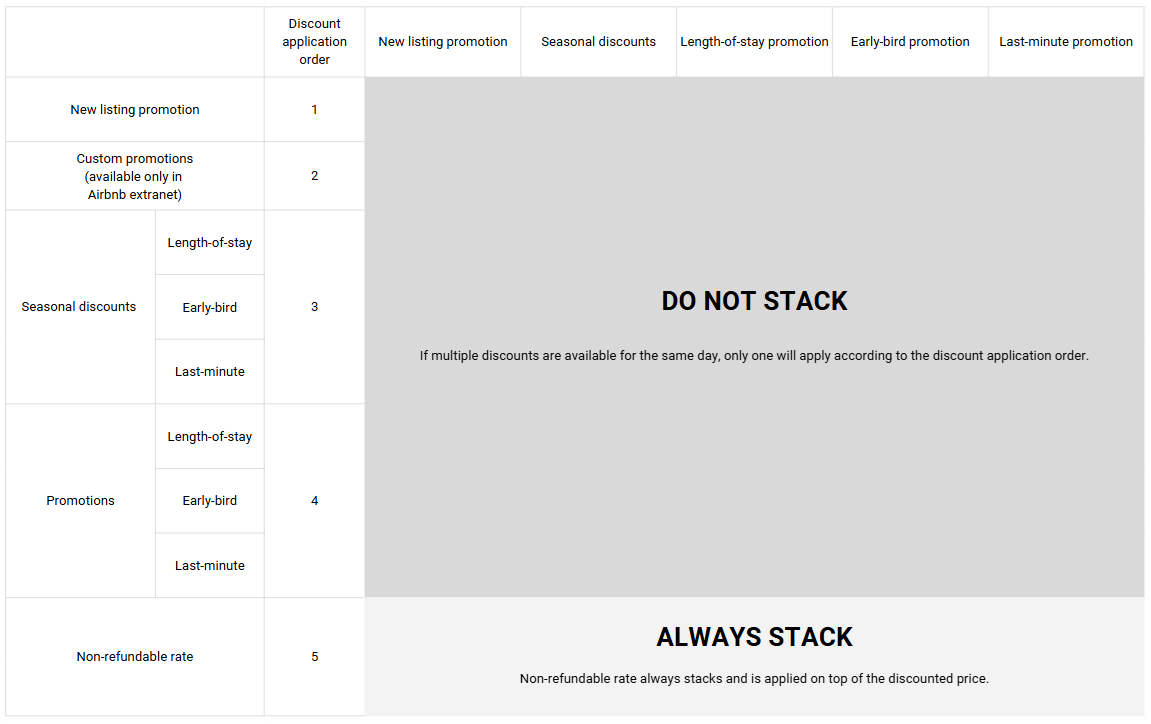 Final outcome: Discounts do not stack, but apply according to the priorities. Airbnb protects your listings from accidental over-discounting by limiting the number of discounts that can apply at a time.