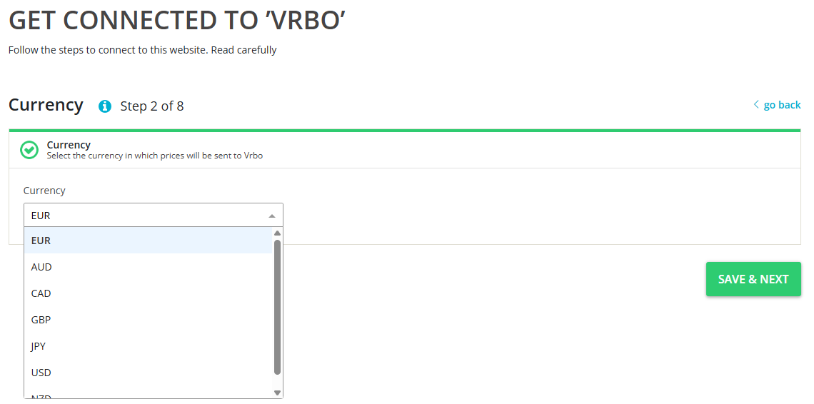 While connecting to Vrbo, you need to select a currency in which you will operate.