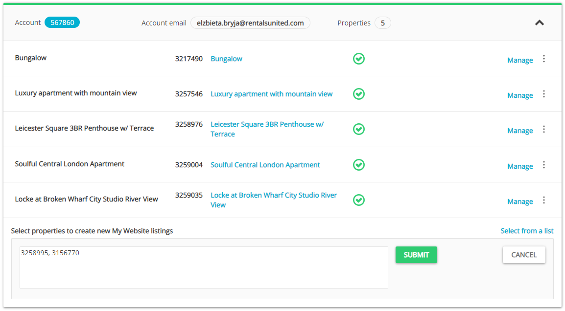 Provide Rentals United IDs that you would like to connect to this channel. Remember to separate them by a comma, a space or a new line! Click Submit.