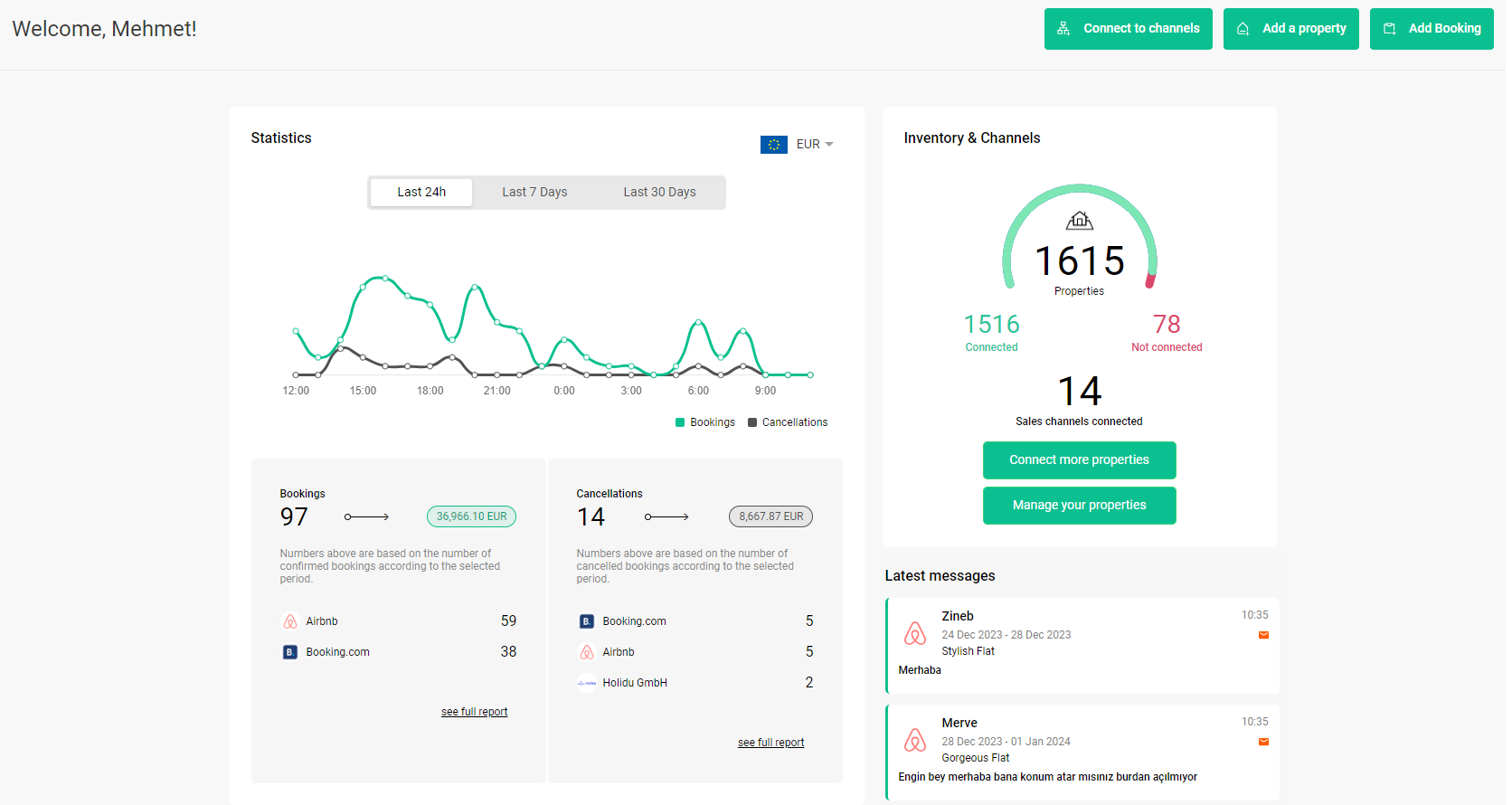 Thanks to aggregated account data, you can keep an eye on how your properties perform by tracking the number of new and cancelled bookings within the selected period. Dynamic graphs give you a quick overview of the seasons when your properties generated the highest and lowest numbers of bookings and how it changed over time.