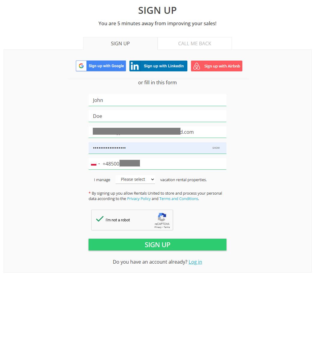 - Go to Rentals United Sign Up page.