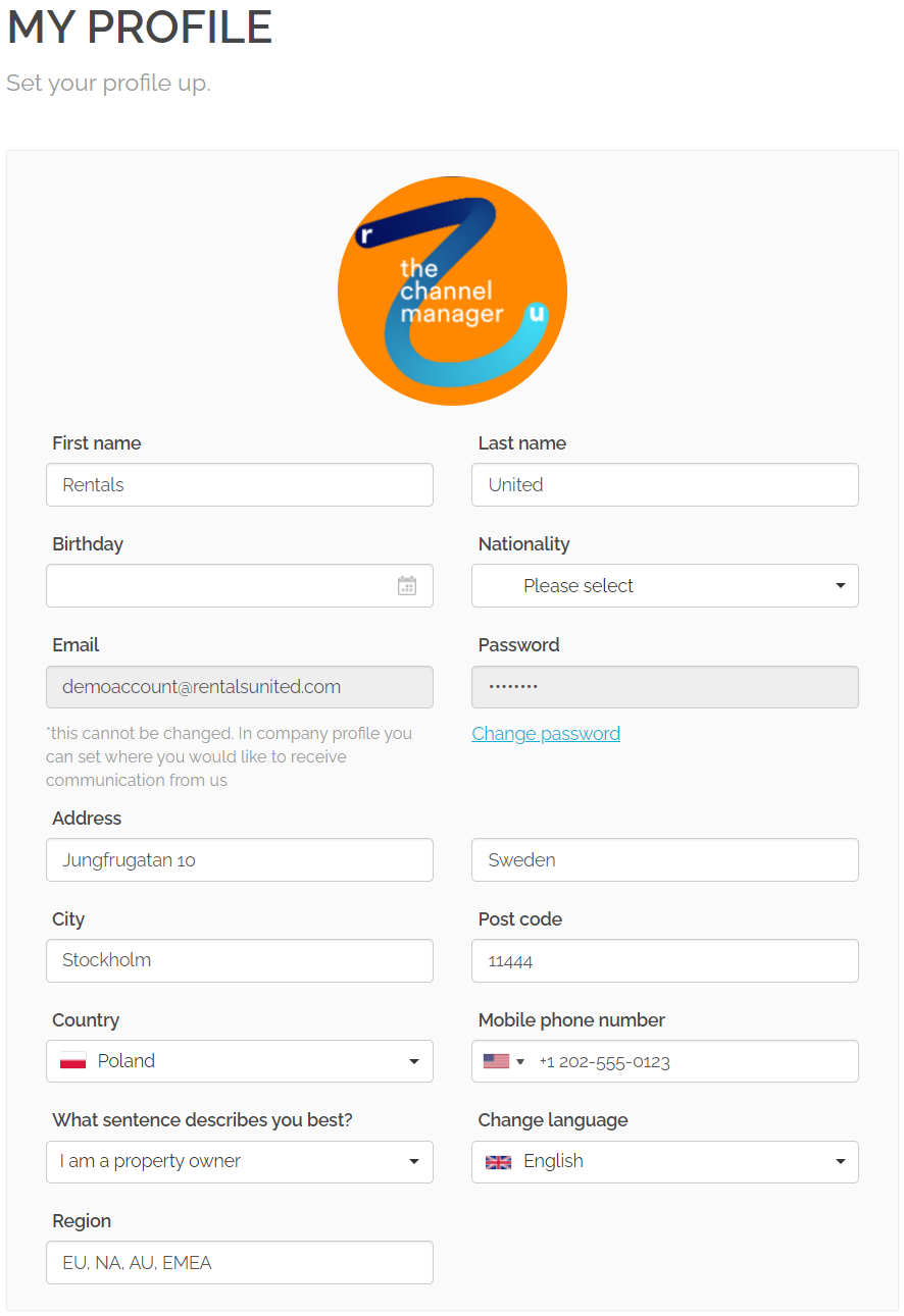 My profile allows you to provide your basic data, like name and surname, email address, mobile number and more. This data will be available for Rentals United exclusively and will not be shared with anyone else.