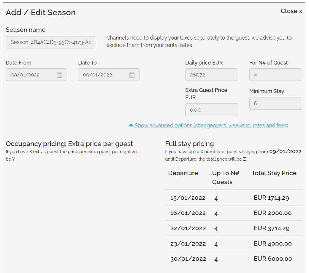 The season refers to a period of time when particular pricing is applied. It is possible to set as many seasons as required, varying in length and specification. The minimum settings require: