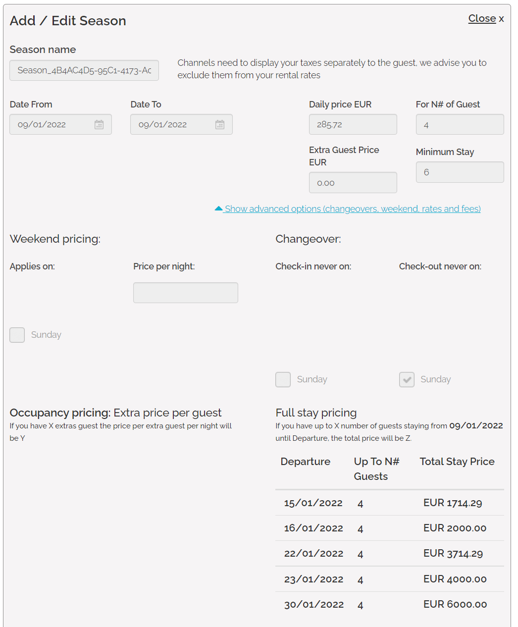 Minimum stay is set based on the shortest stay possible withing the given season. In the below example, the shortest stay is 6-nights long, hence minimum stay is set to 6.