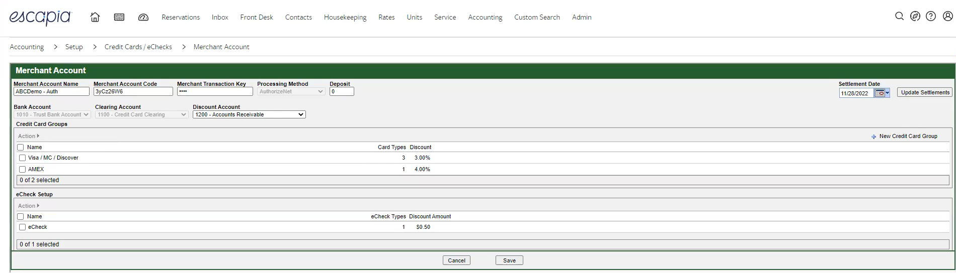 In Escapia: Accounting > Setup > Credit Cards/eChecks > Merchant Account > Credit Card Groups |