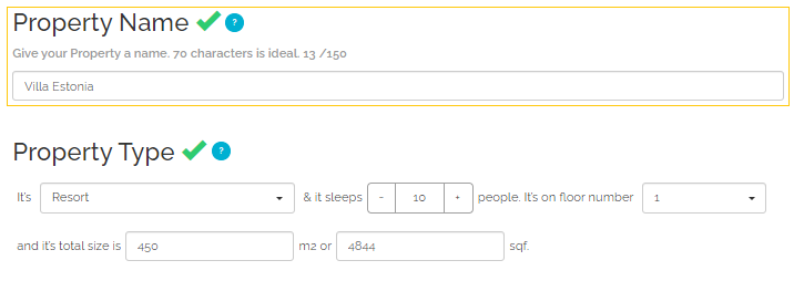 Property name is the basic characteristic that differentiates the property from others and will be displayed across all the Sales Channels the property is connected to. The maximum length of the Property name field in Rentals United is 150 characters, yet for the best performance Rentals United recommends providing a name of approximately 70 characters.