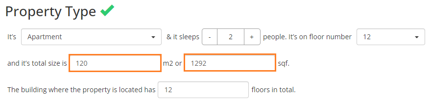 Property size denotes the size of the property, provided either in square meters (m2) or square feet (sqft).
