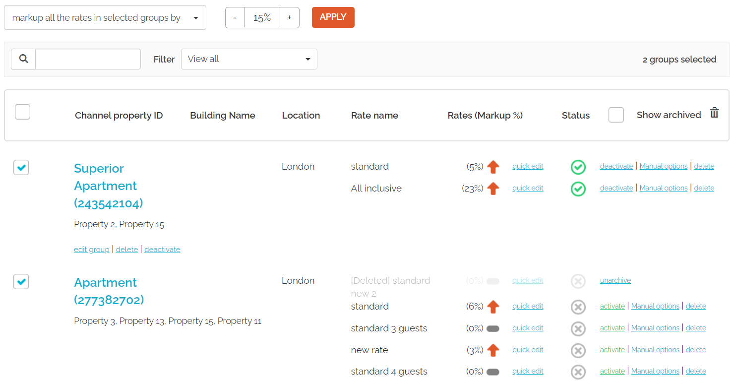 - If there are multiple rates in a group and you deactivate one - you stop sending availability and prices to Sales Channel, leaving the property open to new reservations on the Sales Channel channel. This means that new reservations can be made through Sales Channel, but the channel will not receive the updates in availability and pricing from Rentals United.